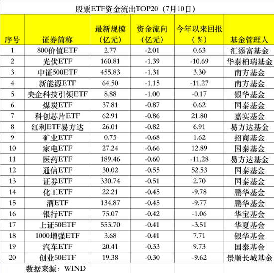 从资金净流出排行看,7月10日,800价值ETF资金流出居前,单日净流出2.01亿元,此外,光伏ETF、中证500ETF、新能源ETF当日资金流出均超1亿元。另有央企、红利、煤炭、家电相关ETF,资金流出位居当日股票ETF前20。