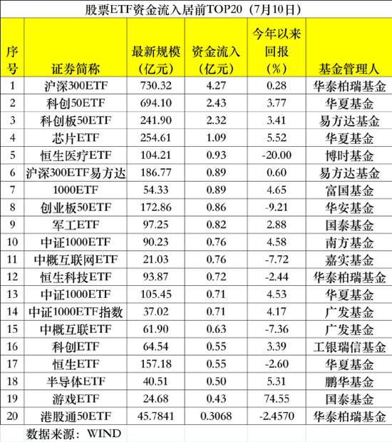 从资金净流入排行看,7月10日,多只沪深300ETF、科创50ETF等指数产品受到资金青睐,资金净流入排行居前。比如华泰柏瑞沪深300ETF当日获得4.27亿元资金流入。此外,科创50ETF、科创板50ETF分别“吸金”2.43亿元、2.32亿元。而芯片、军工、半导体、游戏ETF成为当日资金流入居前的细分赛道指数产品,资金流入位居当日股票ETF前20。