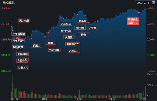 7月11日,A股三大指数高开震荡走高,创业板指表现最强,中小盘股相对活跃。截至收盘,上证指数涨0.55%报3221.37点;深证成指涨0.78%报11028.68点,创业板指涨0.81%报2216.78点。A股合计成交额7746.91亿元,较前一交易日增长1.54%;北向资金全天净买入34.89亿元;其中沪股通净买入19.15亿元,深股通净买入15.74亿元。今日A股有3573只上涨,1407只下跌。