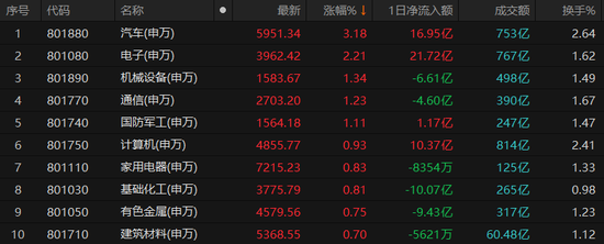7月11日,行业涨多跌少。从31个申万一级行业看,有24个上涨,占比77.42%,汽车行业涨幅居首,达3.18%,大单资金净流入16.95亿元,此外,电子行业涨幅也超2%。下跌方面,煤炭行业居首,跌幅达0.86%。