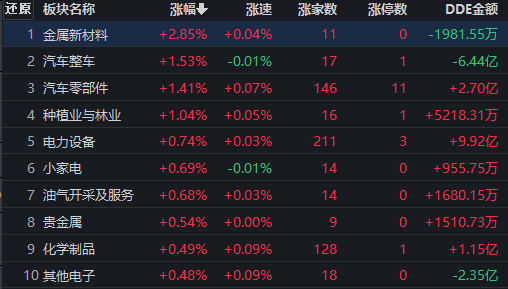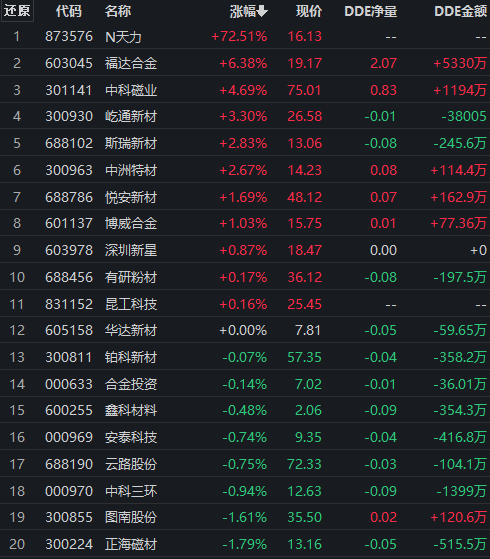 从早盘表现强势的金属新材料行业看,交易中的26只成份股中,有11只上涨,其中,有2只个股涨幅超5%。资金方面,有1981.55万元大单资金净流出该行业。