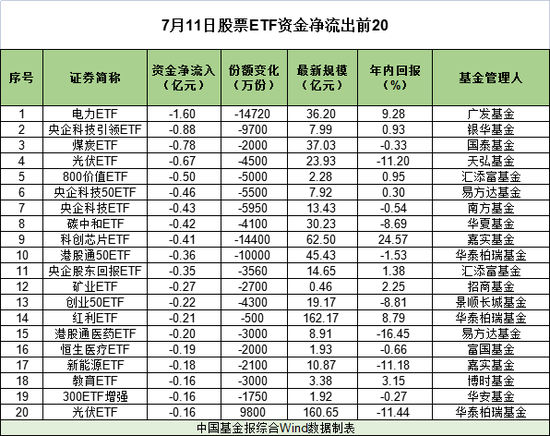 从股票ETF资金净流出排行来看,7月11日当天,电力ETF资金净流出额最多,达1.6亿元,该产品一天内份额减少了1.47亿份。央企科技引领ETF当日资金净流出0.88亿元,排在净流出榜单第二位,份额减少了9700万份;煤炭ETF当日资金净流出0.78亿元,排在净流出榜单第三位,份额减少了2000万份。