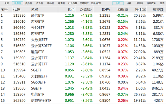 随着通信设备、游戏、计算机设备板块的调整,今日相关主题ETF跌幅居前,其中,通信ETF、游戏ETF、云50ETF位列跌幅前三,跌幅分别为4.93%、4.16%、3.98%。