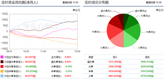 从两市主力资金流向来看,截止收盘,沪深两市主力资金呈现小幅净流入的状态,两市共流入24.3557亿元。其中,超大单净流入88.8557亿元,大单净流出64.5000亿,中单净流出111.2336亿元,小单净流入86.8779亿元。