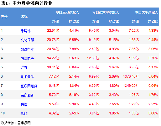 从两市行业板块资金流向来看,半导体板块获主力资金净流入22.51亿,文化传媒板块获主力资金净流入20.78亿,酿酒板块主力资金净流入20.54亿,消费电子行业主力资金净流入14.22亿,证券板块主力净流入10.41亿。