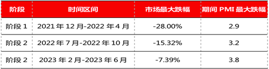如图,本轮经济下行时间也较长,从2021年下半年作为起点,截至到目前市场已经经历过三轮下跌,三个阶段的市场表现以及PMI(采购经理指数)走势变化如下表: