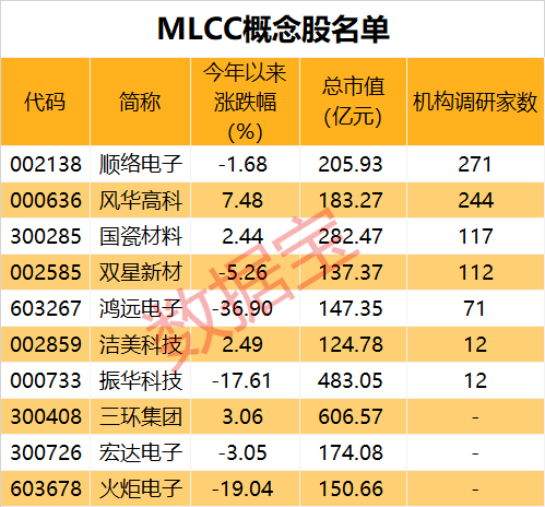 不过MLCC概念股的机构关注度很高,大多数概念股均收获超10家机构参与评级,顺络电子、风华高科、国瓷材料、双星新材年内的机构调研家数均超过100家。
