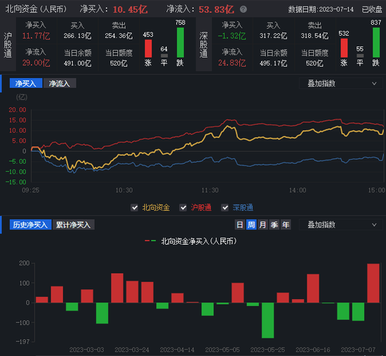7月14日,A股三大指数震荡分化。个股涨少跌多,北向资金净买入逾10亿元。周线来看,沪指形成上穿5周、10周和60周均线的中阳线,受阻于30周均线。有乐观的机构分析人士表示,在政策面仍较为积极且流动性合理充裕的大背景下,震荡向上仍是大趋势。