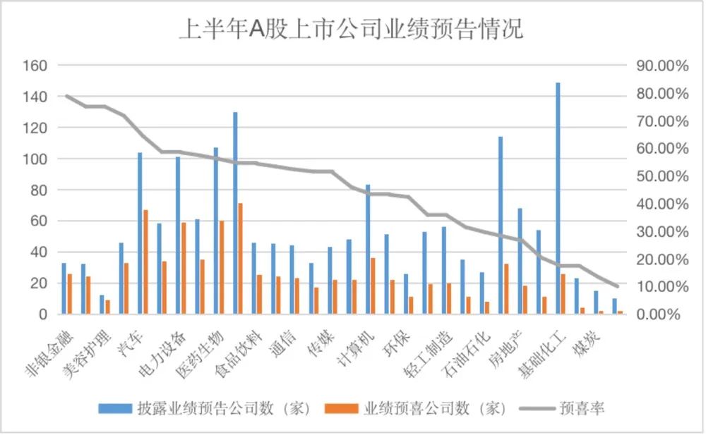 证券时报记者梳理发现,今年上半年,受疫情影响较大的行业业绩复苏迹象明显。非银金融、家用电器、美容护理、社会服务等行业预喜(包括预增、续盈、扭亏、略增预告类型)占比较高,七成以上公司上半年业绩增长比较乐观。汽车行业的预喜率超六成,公用事业、电力设备、商贸零售、医药生物、机械设备、食品饮料等多个行业预喜率在50%以上。