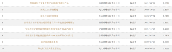 但是有19只权益类理财产品的单位净值低于1元,其中亏损较多的,除了“阳光红卫生安全主题精选”,还有光大理财发行的“阳光红新能源主题”,单位净值为0.6987元,宁银理财发行的宁耀权益类稳健价值FOF策略开放式产品2号、3号,净值为0.7878元、0.7939元。