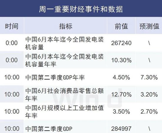 国内方面,市场高度关注将在本周一公布的中国第二季度GDP增速、中国6月社会消费品零售和中国6月规模以上工业增加值等一系列重要经济数据。
