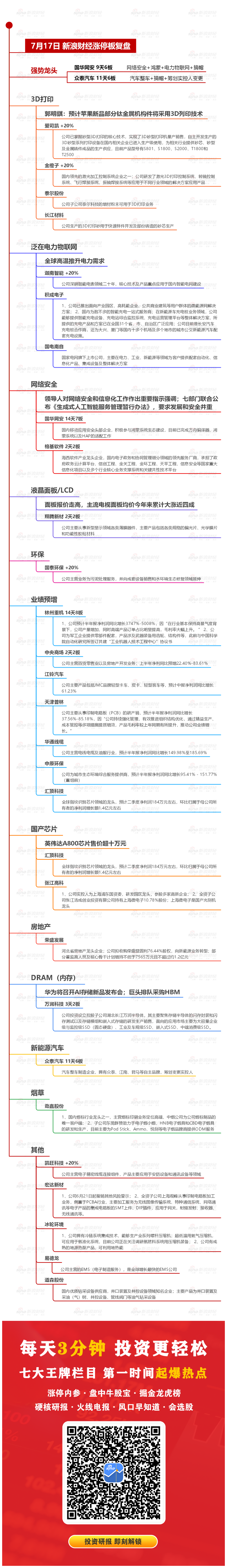【7月17日沪深两市涨停分析】沪指缩量调整收跌0.87%,3D打印、虚拟电厂概念逆势大涨。网络安全概念股