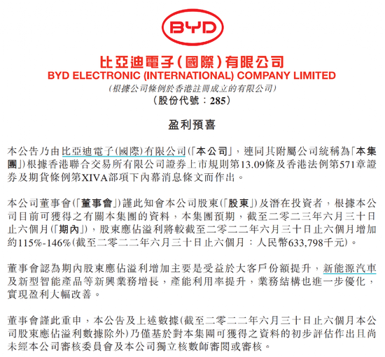 比亚迪电子此前发表盈喜公告表示,2023年上半年股东应占溢利大增115-146%。