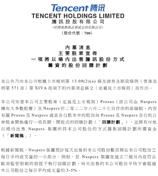 Prosus的减持计划最早要追溯到去年6月27日。当时,据腾讯公告,Prosus及Naspers宣布,将开启一项长期、开放式回购计划,用以提高集团每股资产净值,回购资金将通过Naspers集团有序小幅出售腾讯公司股票获得。Naspers预计,每天出售的腾讯股份数目平均不会超过腾讯日平均成交量的3%-5%。