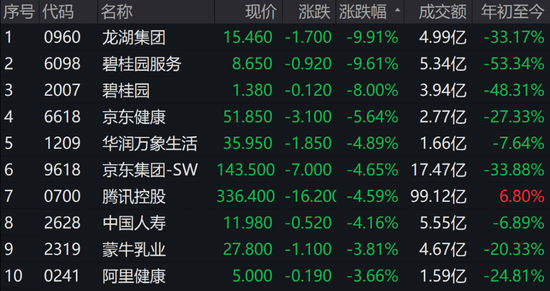 恒生行业指数全线下跌,科技、地产、消费跌幅居前。龙湖集团跌9.91%、碧桂园服务跌9.61%,碧桂园跌8.00%领跌蓝筹。京东、腾讯、阿里等互联网大厂均位列跌幅榜前十。
