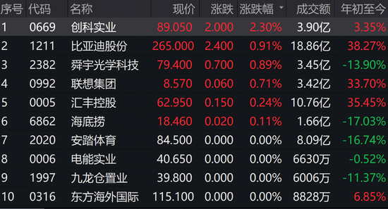 创科实业涨2.30%,比亚迪涨0.91%,舜宇光学科技涨0.89%,领涨蓝筹,连抽古中,近6只录得上涨。汽车产业链逆市上涨,理想汽车、长城汽车涨超2%。比亚迪电子、比亚迪股份绩后均录得上涨,其中比亚迪电子涨超6%。
