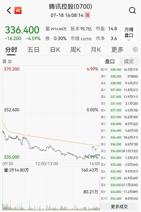 受第一大股东南非Naspers集团荷兰子公司Prosus再度减持消息影响,腾讯股价低开低走,最大跌幅达4.99%,全日收于336.40港元,跌4.59%,市值缩水超1550亿港元。
