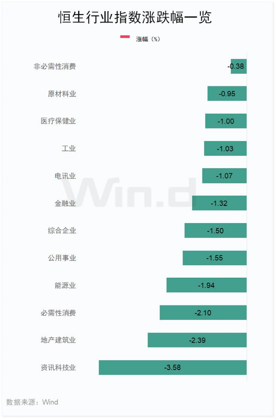 从行业表现看,恒生行业指数日内全线下跌,资讯科技业跌3.58%,地产建筑业跌2.39%,必需性消费跌2.1%。