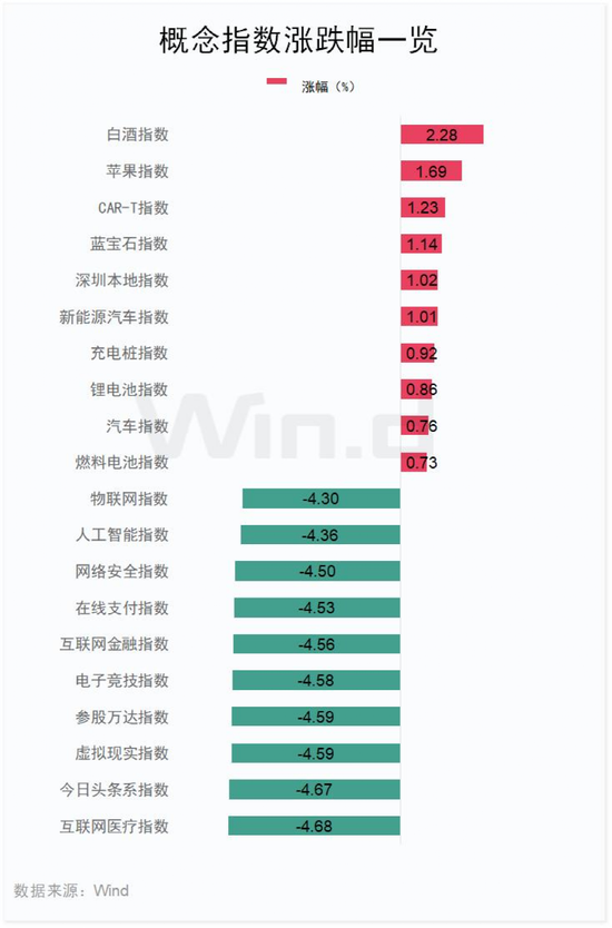 从盘面来看,Wind概念板块多数下跌,互联网医疗指数跌4.68%,今日头条系指数跌4.67%,虚拟现实指数跌4.59%。涨幅方面,白酒指数涨2.28%,苹果指数涨1.69%,CAR-T指数涨1.23%。