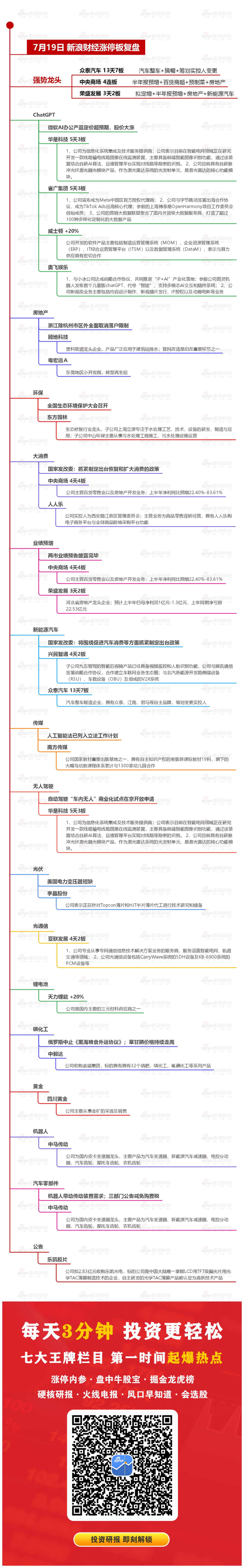 【7月19日沪深两市涨停分析】沪指探底回升翻红、地产股、黄金股集体走强。