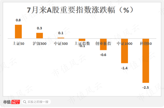 7月来,A股重要指数中,表现最好上证50涨幅不到1%,而最惨的科创50跌幅2.5%,上证指数也失守3200点,市场赚钱效应较差。