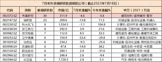 7月来被调研次数最多的是埃斯顿和华利集团,分别被调研8次、7次,前者是机器人概念,后者则是传统的纺织服饰股。