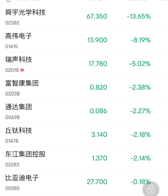 舜宇光学科技领跌,果链各股齐挫。高伟电子跌超8%,瑞声科技跌超5%,富智康集团、通达集团、丘钛科技、东江集团控股跌超2%,比亚迪电子跟跌。