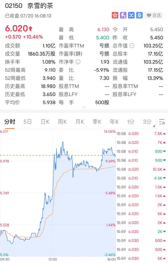 7月20日周四,港股“新式茶饮第一股”奈雪的茶股价逆势向上,盘中一度涨超12%,收涨10.46%,报6.02港元/股,最新总市值103.25亿港元。