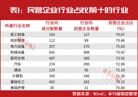 A股的二级市场也有异动。在7月20日,沪指全天收跌0.92%的情况下,部分细分领域表现依然亮眼,如以轻工制造、医药生物和纺织服饰等行业为代表的消费领域,以及电力设备、机械设备等行业为代表的科技领域普遍跑赢市场,且部分涨幅更是不俗。而分析来看,这些行业均具备一个典型的特征,即民营企业数量占比较高。如截至目前,轻工制造、纺织服饰和电力设备等行业的民营企业数量占比分别为79.87%、79.46%和75.63%,在申万31个一级行业中占据前三席位(见表1)。