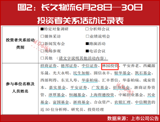 此外,部分知名投资者的潜在重仓股也在不断出现。如长久物流在6月28日~30日开门迎客,接待了众多前来调研的机构,林园投资赫然在列(见图2)。据Wind统计,林园投资现身A股公司调研的次数并不多,今年以来至今仅有三次。