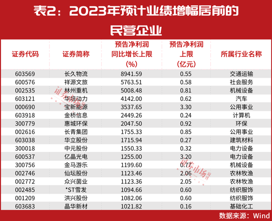 部分民营企业更是成为业绩筑底反转的领头羊,如预计净利润同比增长上限翻倍的有257家,翻十倍以上的有17家(见表2)。其中预计净利润同比增长上限最高的是长久物流,公司预计上半年实现归母净利润4000万元~5500万元,同比增长6475.70%~8941.59%。据悉,长久物流是国内的独立于汽车制造企业的第三方汽车物流企业,而在上半年汽车行业稳健发展的背景下,公司主营业务顺势逐步恢复。
