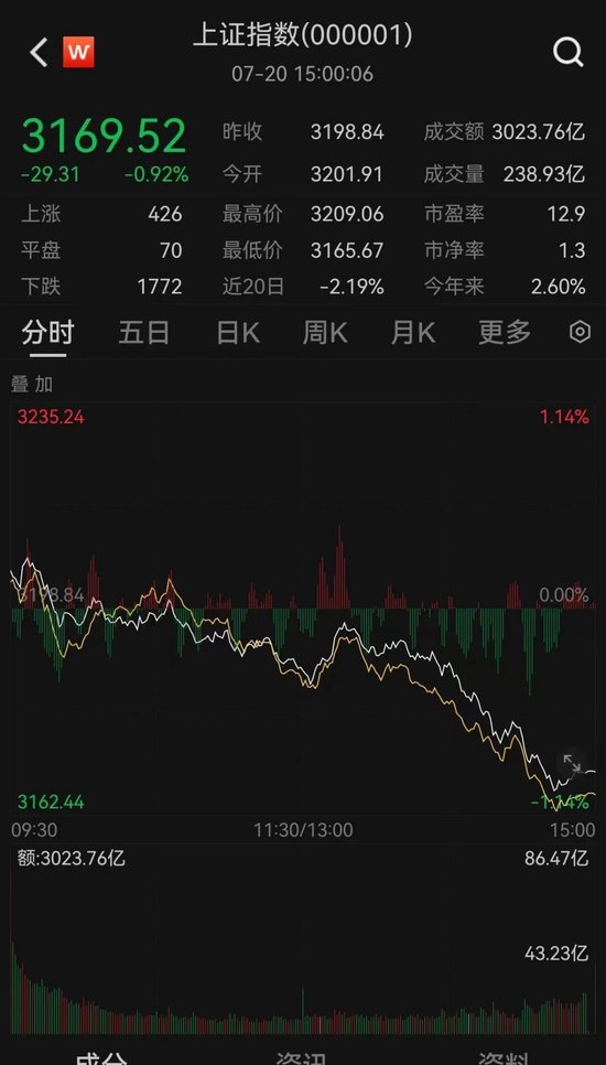 7月20日,A股三大指数高开低走,集体收跌。早间,三大指数集体高开,开盘后短暂拉升后,早盘基本呈现横盘震荡走势,沪指早盘盘中一度重回3200点,午后,三大指数成单边下挫走势。