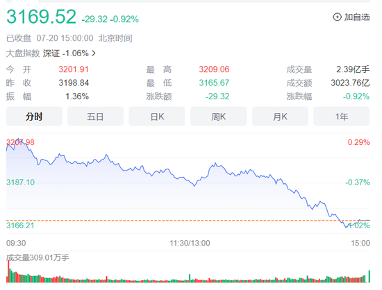 ▲北京时间7月20日15:00,上证指数收盘下跌29.32点,跌幅为0.92%,报收3169.52点,成交额3023.76亿元。