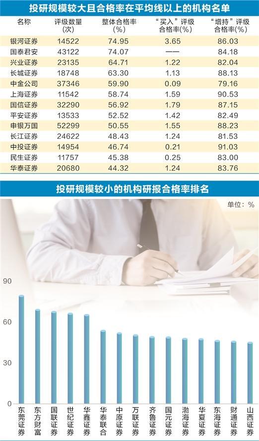 合格率方面,在统计区间内,研报发布数量较多(1万份以上)且整体合格率在平均线以上的机构共计13家。银河证券和国泰君安合格率居前,均超过74%;兴业证券、长城证券紧随其后,合格率在63%以上;另有中金公司、上海证券、国信证券等5家机构合格率超过50%。
