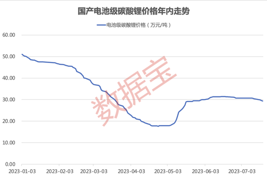 今年以来,碳酸锂现货价格出现明显波动,年初碳酸锂现货价格为51万/吨;前四个月碳酸锂价格快速下跌,4月中旬低点为17.65万元/吨,跌幅超过65%;5月开始价格又急速回升,目前稳定在30万元/吨上下。