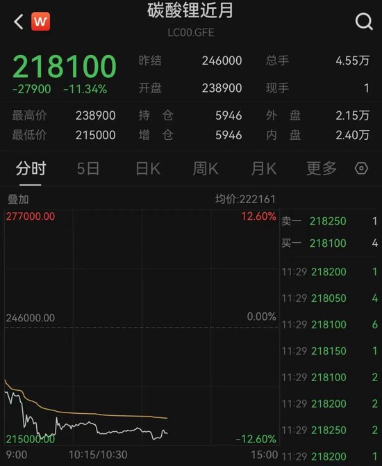 今日碳酸锂期货上市挂牌交易。开盘后,首批上市的7个合约全部低开,主力合约开盘下跌3%。截至早盘收盘,除主力合约碳酸锂2401下跌11.34%外,其余6个合约均以跌停收盘,报价21.16万元/吨。