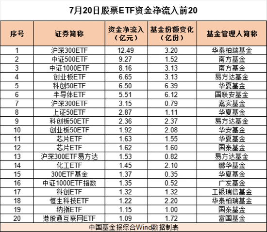 从资金净流入排行来看,7月20日当日,宽基ETF产品吸金居前,其中,沪深300EF、中证500ETF、中证1000ETF位列前三,资金净流入分别为12.49亿元、9.27亿元、8.16亿元;此外,尽管半导体板块下跌,但资金却持续买入,当日半导体ETF份额增加了6.12亿份,资金净流入达5.5亿元,跻身资金净流入榜前10。另有2只芯片ETF当日份额增幅也均超1.5亿份,资金净流入超1.6亿元。