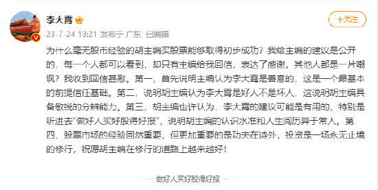 7月24日,英大证券首席经济学家李大霄对胡锡进买股成功一事发表评论,他表示,股票市场的经验固然重要,但更加重要的是功夫在诗外,投资是一场永无止境的修行。