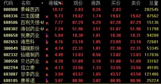 创新药概念今日强势拉升,截至收盘,景峰医药涨停,三生国健涨近10%,百利天恒、海创药业涨超7%,海思科、福瑞股份涨近5%,恒瑞医药涨近3%。