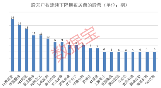 股东户数连续下降个股中,连降期数居前的有山西证券、华塑股份。其中,山西证券最新股东户数为12.25万户,已连续减少16期;华塑股份股东户数连降14期,最新户数为6.49万户。股东户数连降期数较多的还有*ST同达、新宝股份、海鸥住工等。