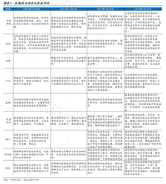 会议对总体经济形势研判中性客观,提到短期经济面临新的困难挑战,同时曲折式修复下长期向好的基本面没有改变。7 月政治局会议认为,当前经济运行面临“国内需求不足、一些企业经营困难、重点领域风险隐患较多和外部环境复杂严峻”等新的困难挑战,在此背景下,经济恢复“曲折式前进”,但“长期向好的基本面没有改变”。与 4 月政治局会议思路一致,当前解决问题思路主要围绕“扩大内需”,“提振信心”,“防范风险”三方面展开。