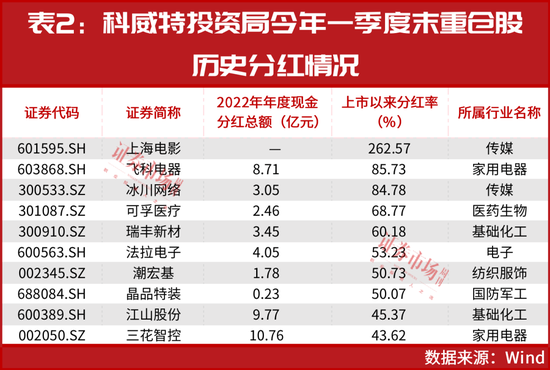 这42家公司也普遍是分红大户。如Wind统计数据显示,截至目前已有37家公司进行了2022年的年度分红,占比接近九成,年度现金分红比例(现金派息占归属母公司股东净利润百分比)普遍较高,冰川网络、康恩贝和飞科电器的年度现金分红比例更是超过100%。综合来看,除华大智造上市以来(至去年年报)的分红率为7.38%外,其余公司均在10%以上(见表2)。