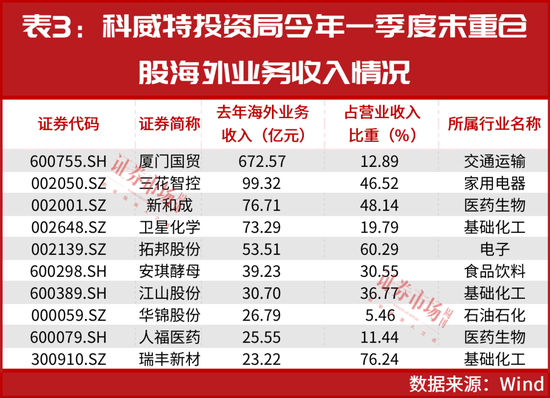 在这之外,这42家公司还有一个共同点,即普遍有海外业务布局。以去年年报为例,这42家公司中有近30家公司披露了海外业务收入情况,其中厦门国贸海外业务收入规模最高为672.57亿元,三花智控、新和成、卫星化学等直追其后(见表3)。对此,有业内人士指出,对于产品能够参与国际化竞争的上市公司来说,“走出去”的市场空间会更加广阔,而“走出去”也会是一种趋势。