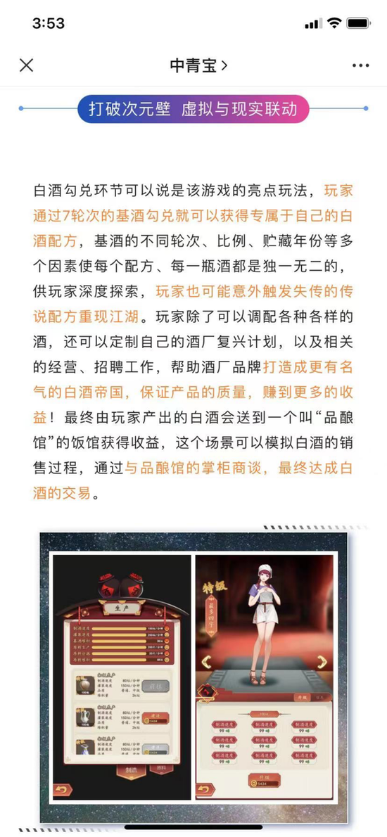 2022年5月19日,在对深交所《问询函》的回复中,中青宝披露2月至5月,处于测试期间的《酿酒大师》充值流水合计2444元。玩家在系统中完成酿酒后,由贵州金沙古酒酒业有限公司(下称“金沙古酒”)提供实体酒完成兑换,双方采取五五分成的方式各自确认收益。