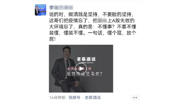 这一则视频很快被李瑞杰转发到朋友圈,怒而表示,“说的对,做酒就是坚持,不要脸的坚持,这哥们把疫情忘了,把XX上A股失败的大环境忘了,真的是:不懂事?不要不懂装懂,懂装不懂。一句话,懂个屁,放个屁!”