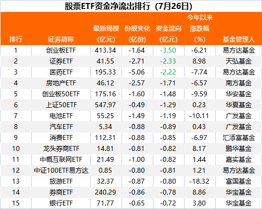 7月26日当天,资金净流出前15只股票ETF中,有11只为行业ETF。从行业窄基指数看,证券ETF、医药ETF当日分别净流出2.22亿元、2.22亿元,南方房地产ETF也有1.71亿元的净卖出。