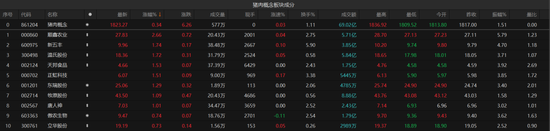 A股方面,猪肉概念今日盘中异动拉升。截至当日收盘,猪肉概念板块整体收涨0.34%。顺鑫农业、新五丰、温氏股份、天邦食品、正虹科技、东瑞股份、牧原股份等涨超1%。值得注意的是,东方财富Choice数据显示,猪肉概念板块持续震荡回暖,自6月1日起至今累计涨幅近6%。