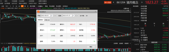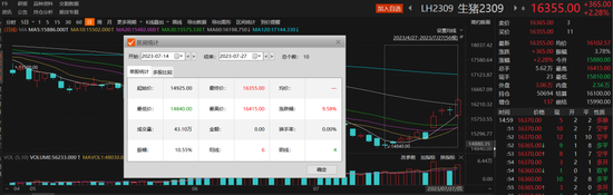 生猪期货方面,今日生猪期货主力2309合约上涨2.28%,收报于16355元/吨。东方财富Choice数据显示,在自7月14日至今的10个交易日内,生猪期货主力2309合约累计涨超9%。