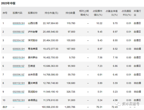 更准确的说,十大重仓都是酒类股,其中包括了7个白酒股、2个啤酒股和1只预调鸡尾酒股票。