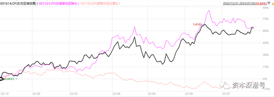 东方区域发展的净值波动大概是到了6月中下旬才和白酒基金“高度同频”,并且直到现在(下图)。